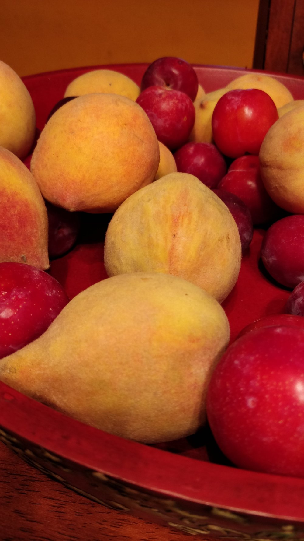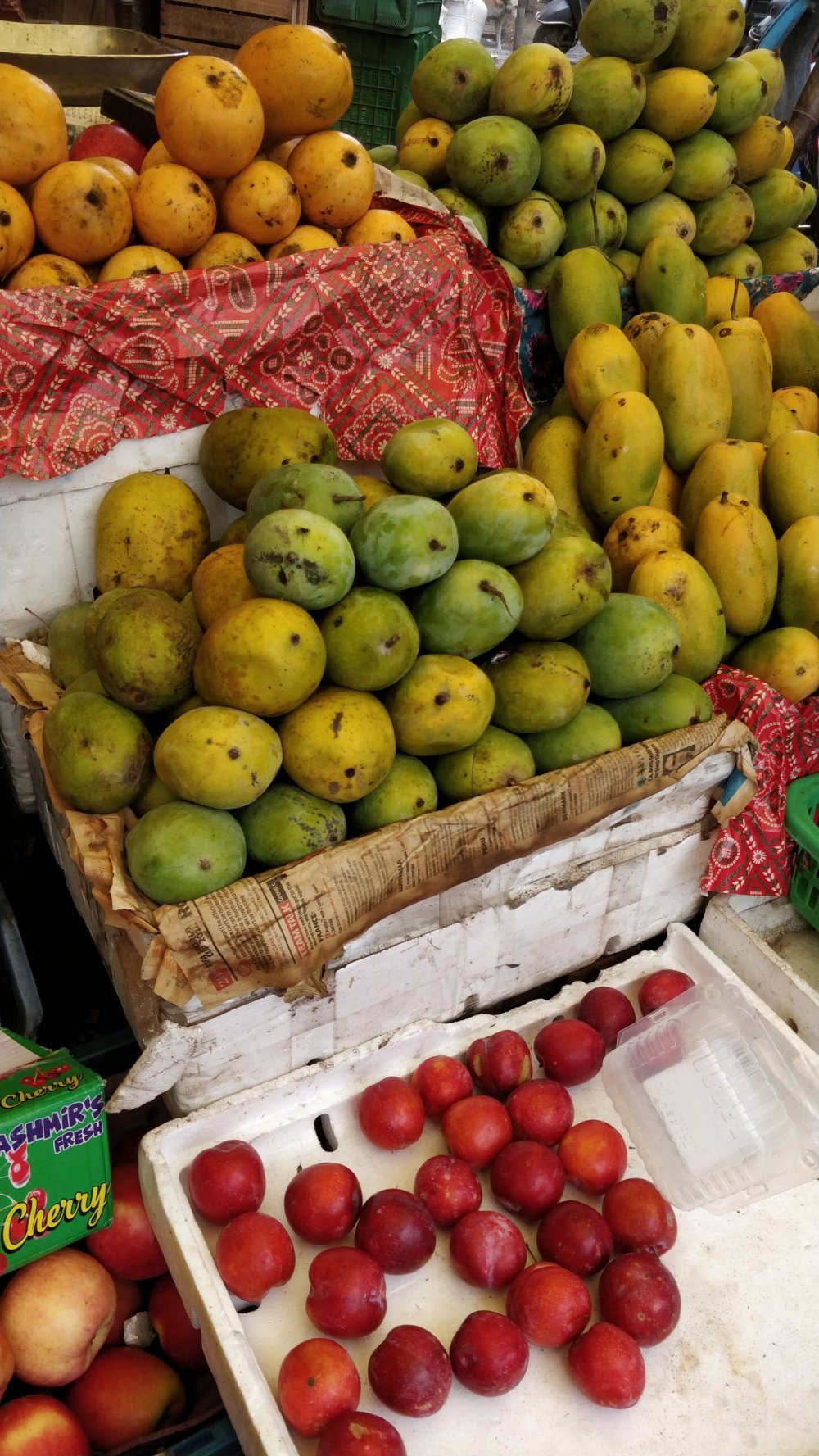 I bought local plums, local peaches, elaichi bananas, a bright red pomegranate, local cherries, the cutest sweetest baby oranges from I-dunno-where, a papaya and some imported William Pears. Apparently the local pears don’t exist anymore (!!!)