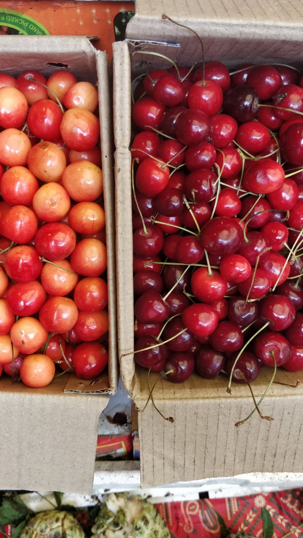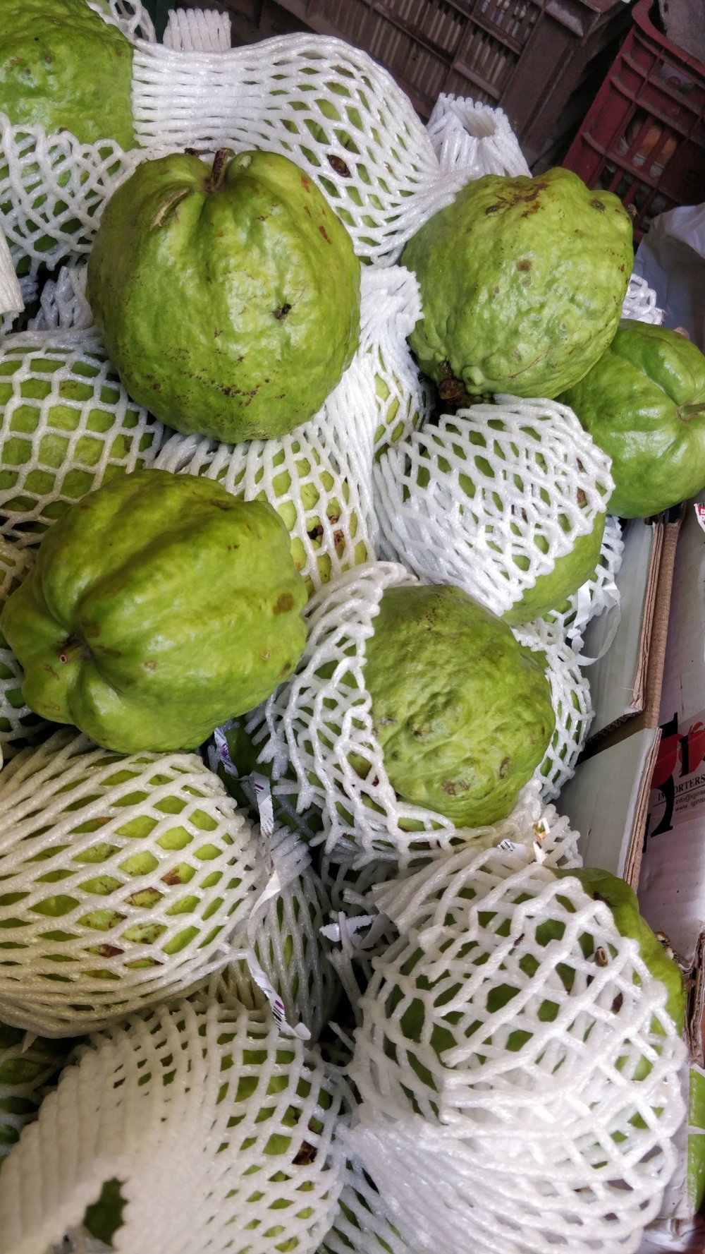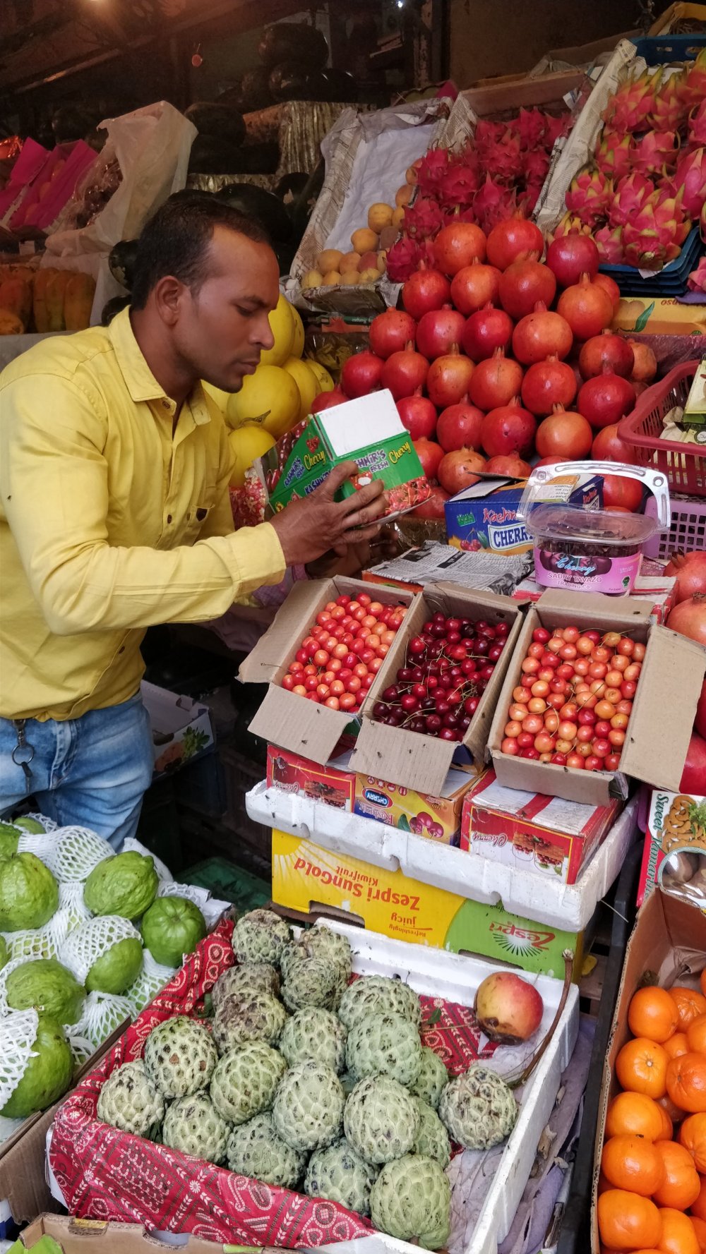 I found ginormous guavas from South Africa, dragon fruit from Malaysia. There were a few peaches and he was demanding gold in exchange for them. There were California purple grapes, pears from New Zealand, and deep red cherries too.