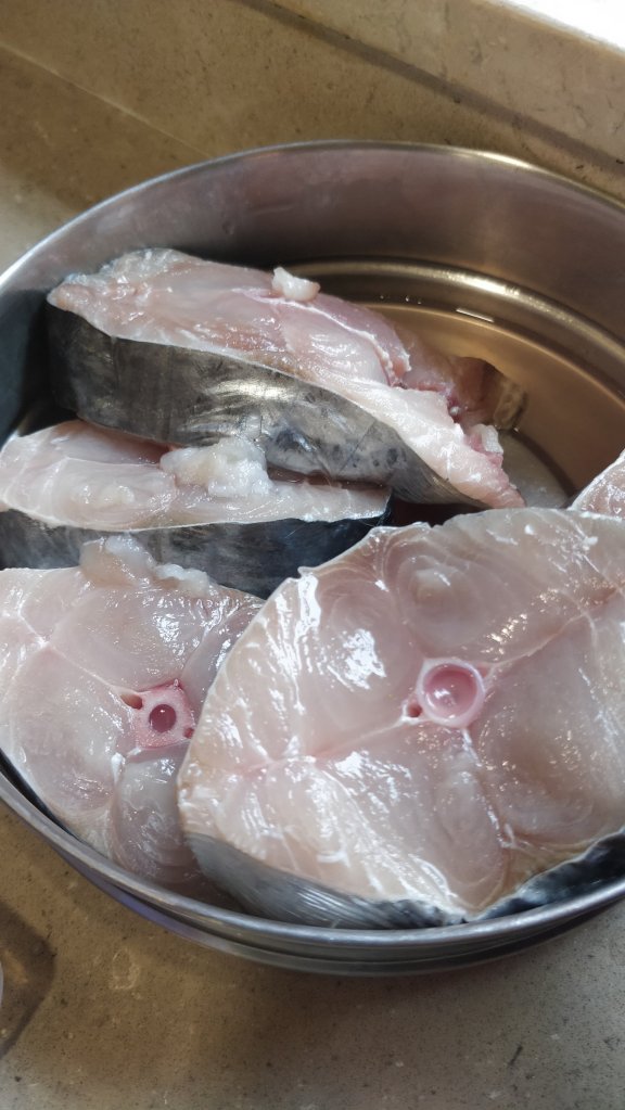 Traditionally made with silvery white pomfret, we next learned the famous Patra ni Machchi, using thick surmai steaks. We made a fragrant green chutney with loads of fresh coriander and smothered the fish in it, wrapping the steaks individually in fresh banana leaves before steaming them. Sanober likes to use surmai over the very small and tasteless pomfret we currently find in the market. The fish was tasty and fragrant and I really loved it.