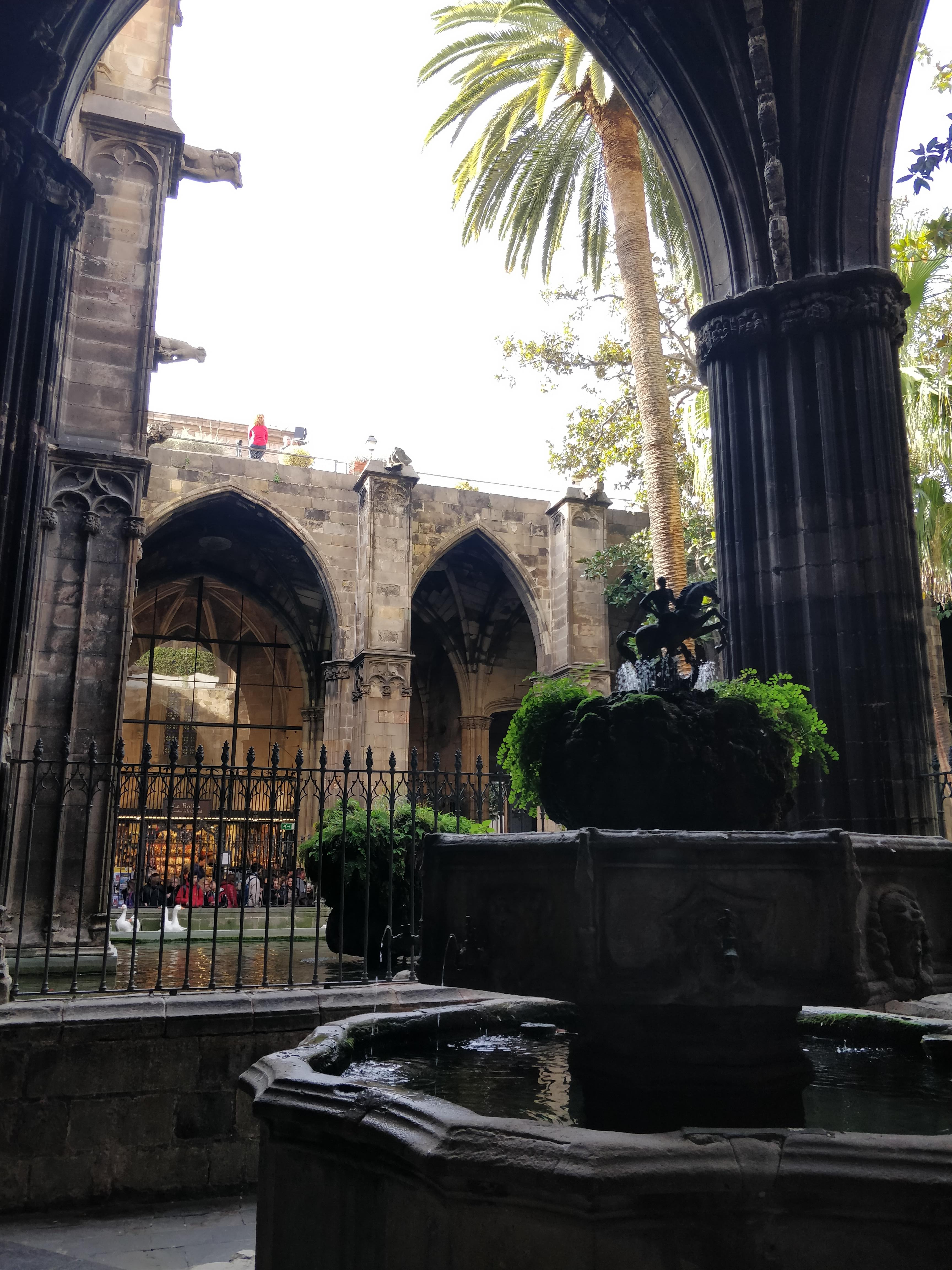The famous Barcelona Cathedral is also here. Built in 1339, it dominates the square with its many gargoyles glaring down at you. The visit inside is free and crowded but those stained glass windows are unmissable. The ornate floors are worn smooth with the footsteps of thousands of pilgrims (and tourists) over the centuries. The interior is grand and gothic in style ( look UP! really, look up, never mind what is before you). Take a moment to say a prayer at the central altar after you visit ornate chapels for saints and angels surrounding the main knave. You may light red candles, or just sit and soak it in. As you head through the exit, you walk around the cloister with it’s white geese in memory of patron Saint Eulalia. https://en.m.wikipedia.org/wiki/Barcelona_Cathedral
