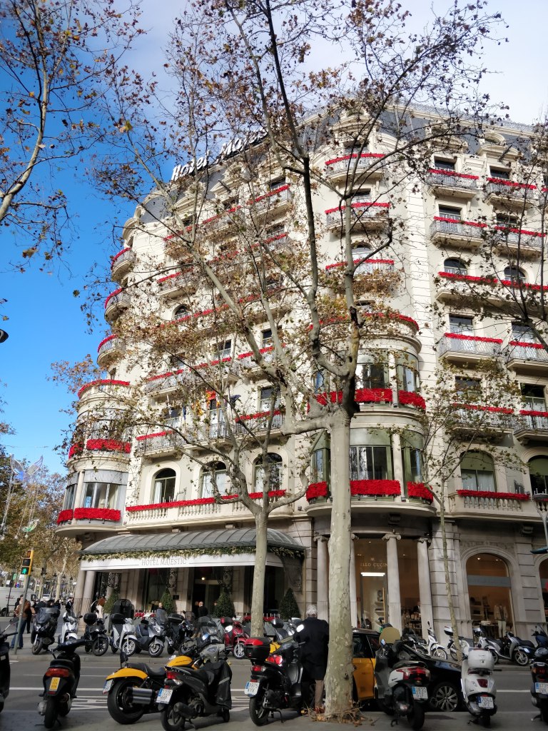 We stayed at the lovely boutique hotel Room Mate Anna, across the road from the main avenue Passeig de Gracias. Anna is a hop away from the metro station, all the fancy stores, the Casa Batllo ( Gaudi’s sumptuous apartment block), Casa Amattler ( next door, house of very good chocolate) and so much more. Walk up or down the Passeig and you reach most of the best spots to visit!!