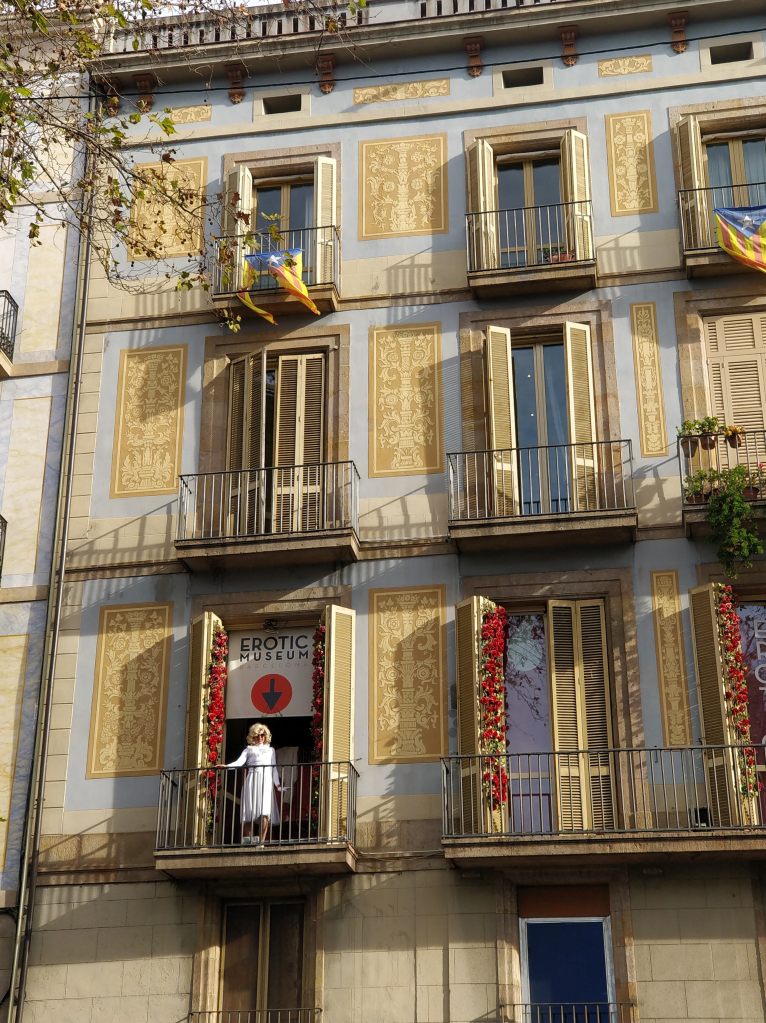 La Ramblas, tourist heaven, is the grand promenade under old trees of Holm oak, plane and Aleppo pines. Florists, souvenir kiosks, cafes, the famous Liceu theatre, and the even more famous market La Boqueria are all here. Look closely past cookie cutter high street stores and you will find a very old music shop selling music sheets and books, a sex museum, very old cafés, lots of lladro figurines and crystal, handmade lace and food shops. Don’t forget to look up, up, up at the sugar candy pink and golden facades with their charming balconies, framed by slim trees dressed for winter. The promenade itself is strung with fairy lights for Nadal. The wind is crisp and the walk is bracing. You enter La Boqueria and risk losing yourself in the fresh, wet market and it’s offerings ( that’s another post entirely) or hang out in one of the little cafes with your wine. This is where you taste and savor food, chocolate, jamin and wine. Try and do a walking tour or a cooking class that includes as trip to La Boqueria. Buy your jamon here if you ahve no time to find the finer stores. Spanish nougat is another must buy.