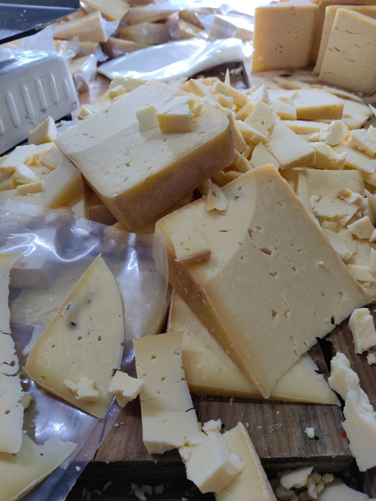 I gather the team together in the weighing and packing room. We laugh and pose for photos. Perhaps their smiles gleam under the mandatory masks as they weigh hunks of cheese, working in unison to ready them for transport. I greedily grab the cutoffs .