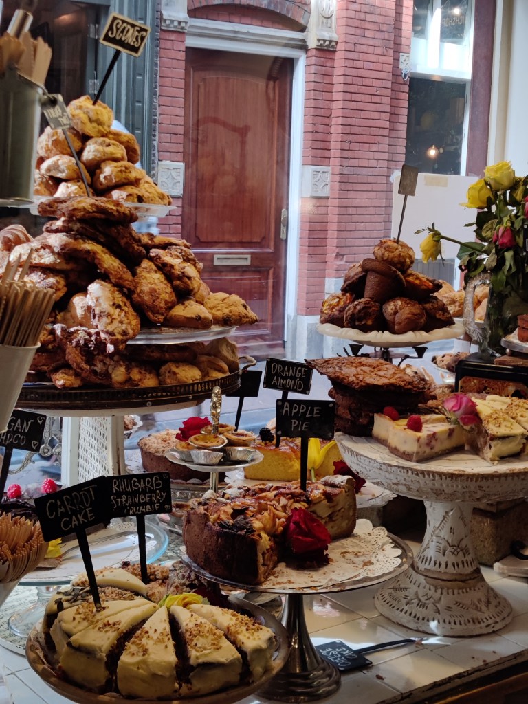 DLK is a wonderful state of mind, an absolute treat for the body and soul. I sit and sigh, staring at the world go by as espresso machines hiss and china clinks to soothing murmurs in many languages around me. I could be in an Enid Blyton, barring the sharp-eyed Tea Room Lady in her apron, and bowls of strawberries and cream. By the way, Dutch cream is soooo delish. All the old fashioned, no frills cake and hearty things to eat, spoil me for choice: apple pie, deep and fragrant; carrot cake, chocolate cake….towering high and smothered in simple frosting.
