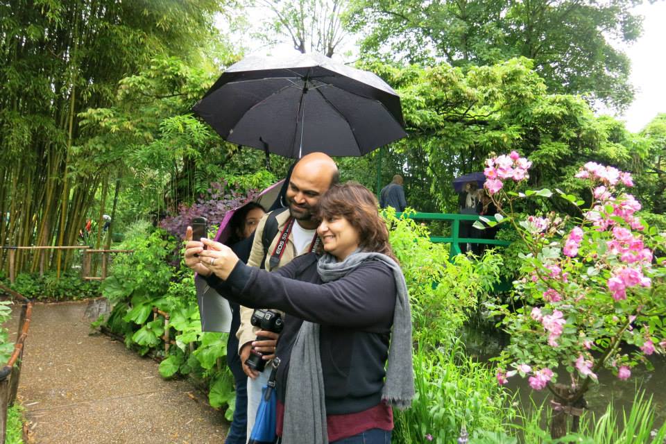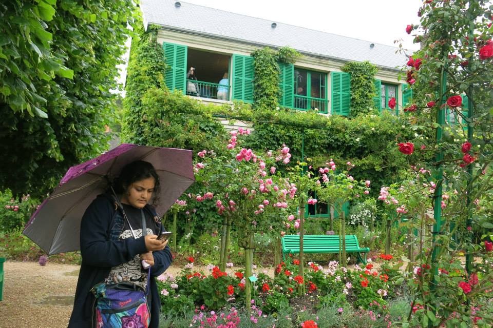 We press on, and eventually reach the tiny village of Giverny. We make our way past cafes and hotels cashing in on Monet s legacy. The town is quaint and best reached by road. I imagine it would normally be jammed with large tour buses. Today, there is hardly anybody. The rain has been kind to us!