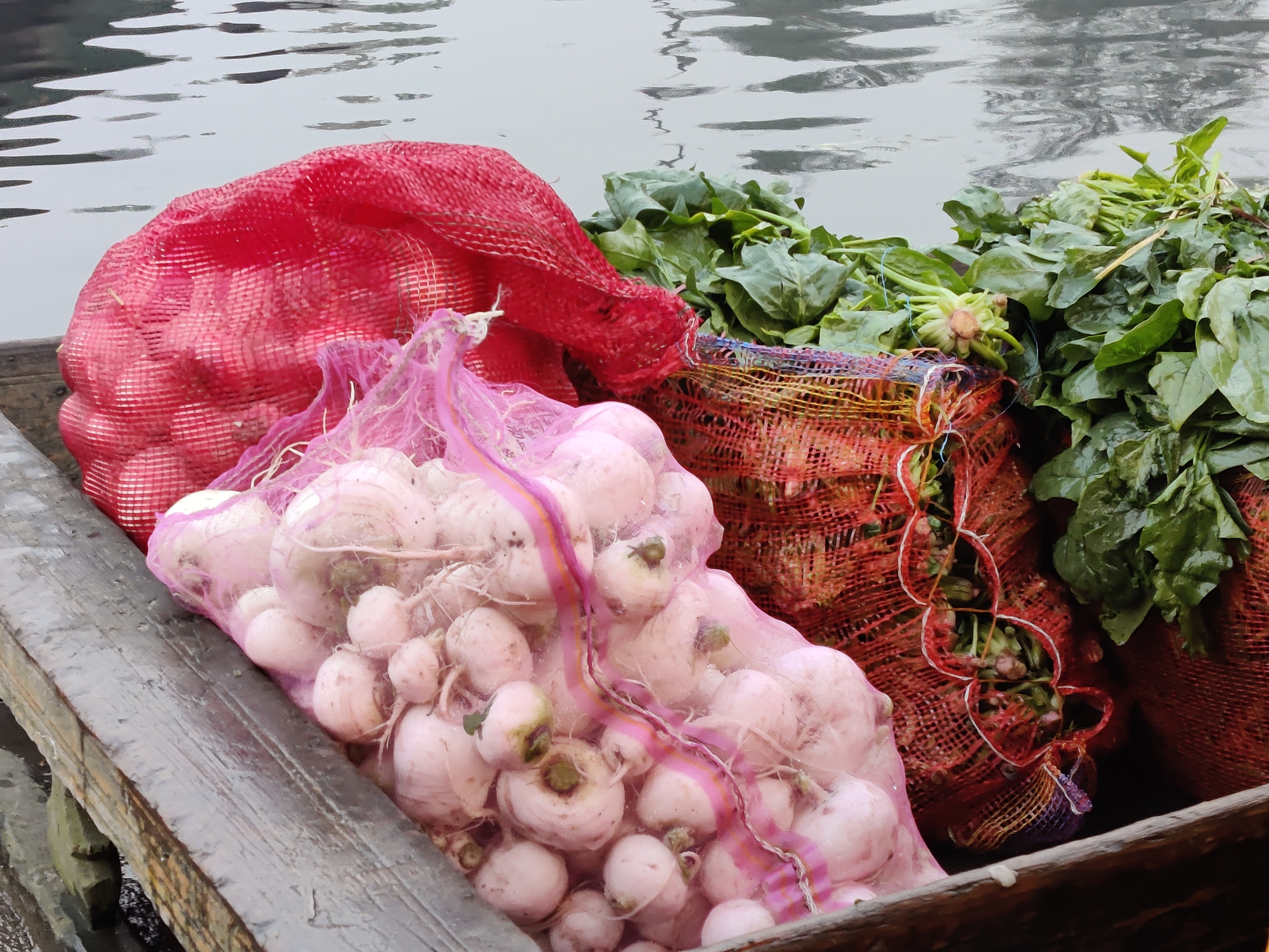 Around me, kashmiri farmers everywhere, in earthy, woollen pherans, wield their oars, slipping and sliding into any available gaps as they tease and compete with one another to haggle and sell stems of freshly harvested nadru or lotus stem, washed and gleaming white, or bundles of deep viridian saag, or white and purple hued kashmiri shalgam ( turnips) and what greens may grow, from their narrow boats. I love their sturdy bearded faces, their wide toothy grins, their faces so elegant despite the hardships they have weathered. Tourism has come to a standstill and it is a particularly harsh winter they face.