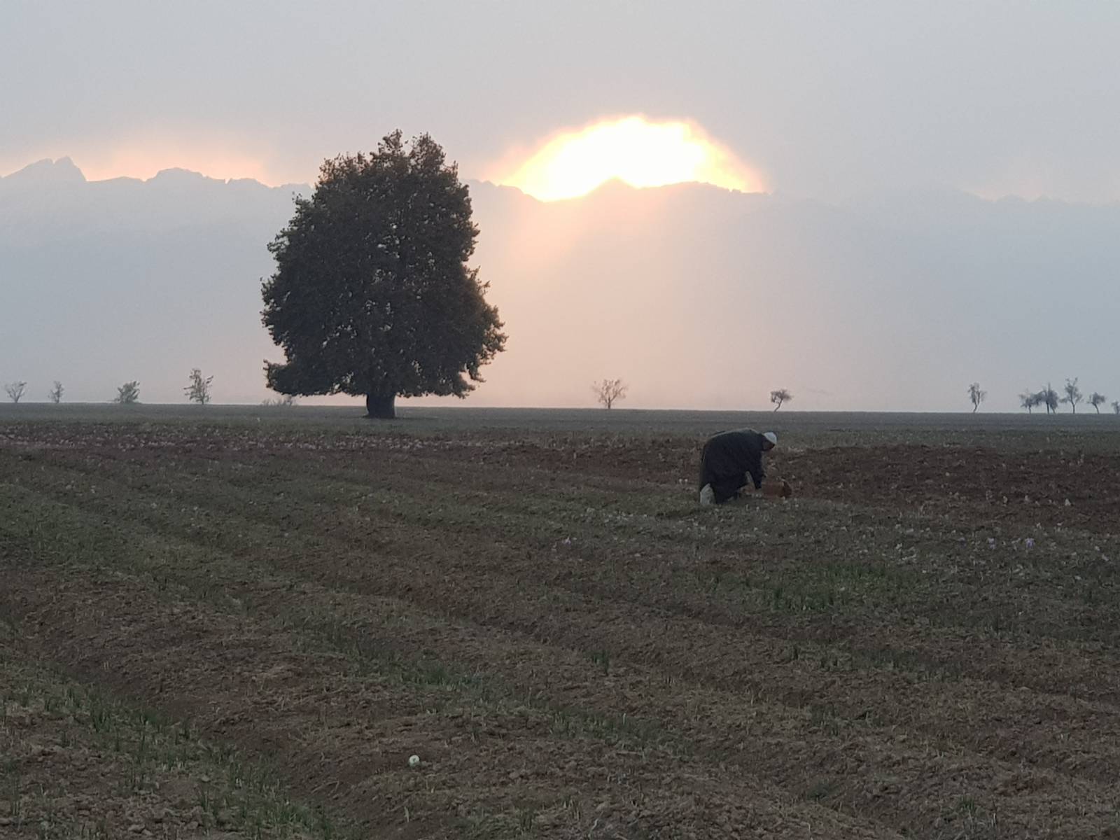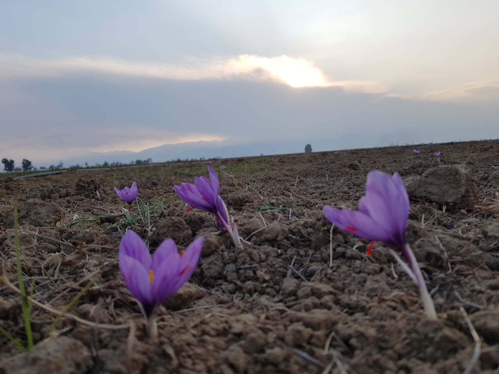 Later on we move, like a large lurching elephant, to the vast open saffron fields of Pulwama, where we film the girl as she works in the setting sun, backlit, with a million delicate purple crocuses in the hard, barren earth. The visual is stark in its beauty.
